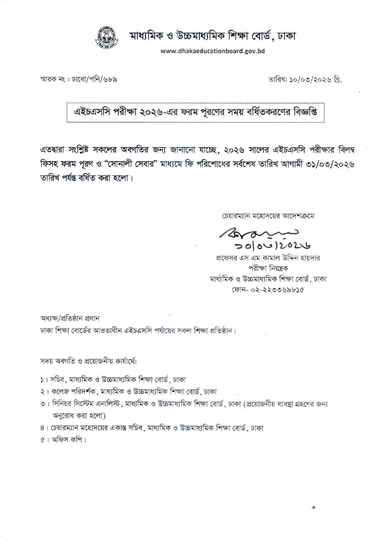 বিজ্ঞপ্তিতে বলা হয়, ২০২৬ খ্রিষ্টাব্দের এইচএসসি পরীক্ষার বিলম্ব ফিসহ ফরম পূরণ ও ‘সোনালী সেবার’ মাধ্যমে ফি পরিশোধের সর্বশেষ তারিখ আগামী ৩১ মার্চ পর্যন্ত বর্ধিত করা হলো।