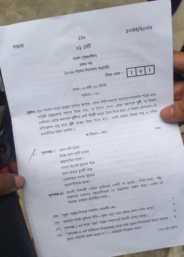 ২০২৬ সালের এসএসসি, দাখিল ও সমমানের প্রথম দিনের পরীক্ষা শেষ হয়েছে। মঙ্গলবার (২১ এপ্রিল) প্রথম দিনে ৯টি সাধারণ শিক্ষা বোর্ডে বাংলা প্রথম পত্র পরীক্ষা অনুষ্ঠিত হয়। এ পরীক্ষার প্রশ্নপত্র দ্য ডেইলি ক্যাম্পাসের হাতে এসেছে।