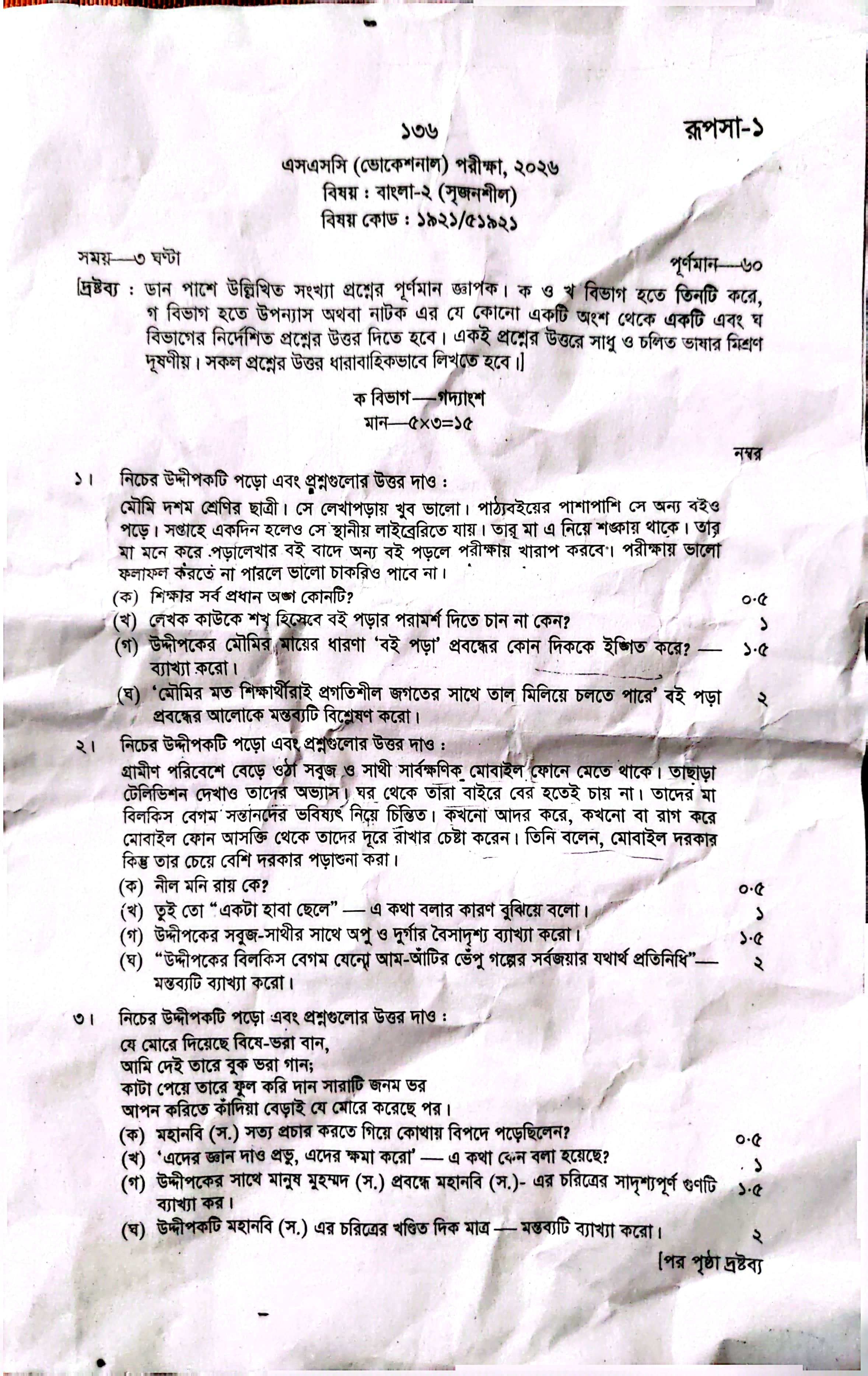 ২০২৬ সালের এসএসসি ও দাখিল ভোকেশনালের প্রথম দিনের পরীক্ষা শেষ হয়েছে। মঙ্গলবার (২১ এপ্রিল) প্রথম দিনে কারিগরি শিক্ষা বোর্ডে বাংলা-২ বিষয়ের পরীক্ষা অনুষ্ঠিত হয়। এ পরীক্ষার প্রশ্নপত্র দ্য ডেইলি ক্যাম্পাসের হাতে এসেছে।