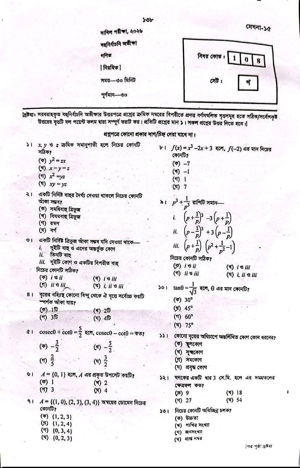 চলমান দাখিল পরীক্ষার তৃতীয় দিনে আজ রবিবার (২৬ এপ্রিল) অনুষ্ঠিত হয়েছে গণিত পরীক্ষা। এদিন সকাল ১০টা থেকে শুরু হয়ে বেলা ১টা পর্যন্ত এ পরীক্ষা অনুষ্ঠিত হয়।