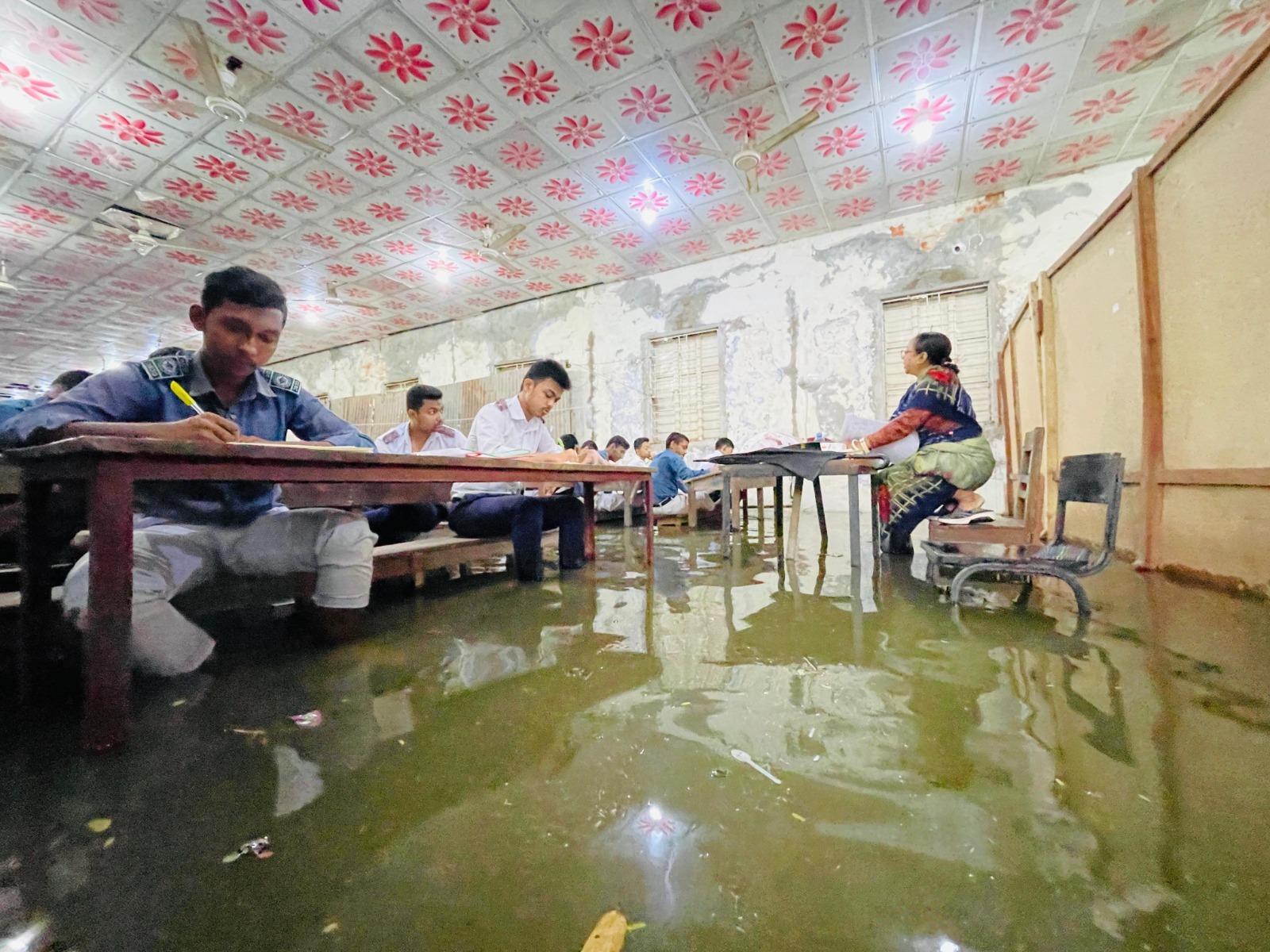 পরীক্ষার্থীরা জানান, পরীক্ষাকেন্দ্রের কক্ষে পানি জমে যাওয়ায় পরীক্ষার্থীরা চরম ভোগান্তির মধ্যে পড়েন। পানি এড়িয়ে উত্তরপত্র লেখার জন্য অনেকেই বেঞ্চের ওপর পা তুলে বসে পরীক্ষা দিতে বাধ্য হন।