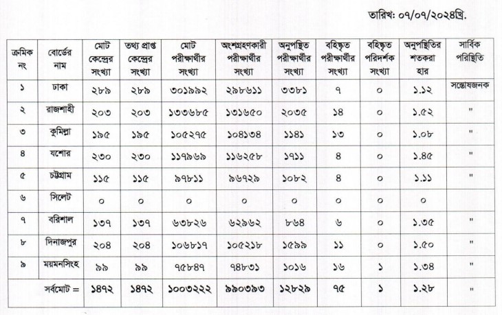 আন্তঃশিক্ষা বোর্ড সমন্বয় কমিটির সভাপতি এবং ঢাকা শিক্ষা বোর্ডের চেয়ারম্যান অধ্যাপক তপন কুমার সরকার স্বাক্ষরিত বিজ্ঞপ্তিতে বলা হয়েছে ৭ জুলাইয়ের পরীক্ষায় ৯ লাখ ৯০ হাজার ৩৯৩ জন শিক্ষার্থী অংশগ্রহণ করে। অনুপস্থিত ছিল ১২ হাজার ৮২৯ জন, যা মোট পরীক্ষার্থীর ১ দশমিক ২৮ শতাংশ।