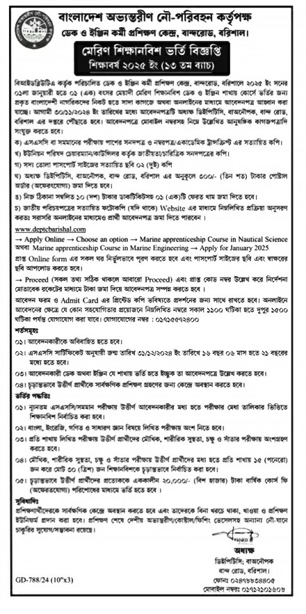 বাংলাদেশ অভ্যন্তরীণ নৌপরিবহণ কর্তৃপক্ষ ২০২৫ সালের এক বছর মেয়াদি মেরিন শিক্ষানবিশ (ডেক ও ইঞ্জিন) কোর্সে ভর্তিতে বাংলাদেশি নাগরিকদের নিকট অনলাইনে আবেদন আহ্বান করেছে। আগ্রহী প্রার্থীরা আগামী ৩০ নভেম্বর পর্যন্ত আবেদন করতে পারবেন।