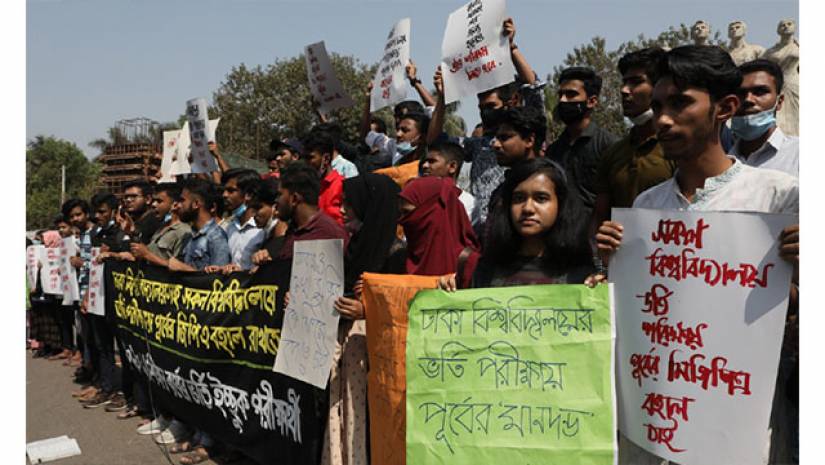 ঢাকা বিশ্ববিদ্যালয়সহ দেশের সকল পাবলিক বিশ্ববিদ্যালয়ের স্নাতক ভর্তি পরীক্ষায় পূর্বের জিপিএ বহাল রাখার দাবিতে মানববন্ধন ও বিক্ষোভ কর্মসূচি পালন করেছেন শিক্ষার্থীরা। রবিবার (২৮ ফেব্রুয়ারি) দুপুরে ঢাকা বিশ্ববিদ্যালয়ের রাজু ভাস্কর্যের পাদদেশে ২০২০-২১ শিক্ষাবর্ষের ভর্তি ইচ্ছুক পরীক্ষার্থীদের ব্যানারে এক মানববন্ধন অনুষ্ঠিত হয়। পরে ক্যাম্পাসে একটি বিক্ষোভ মিছিল বের করা হয়।