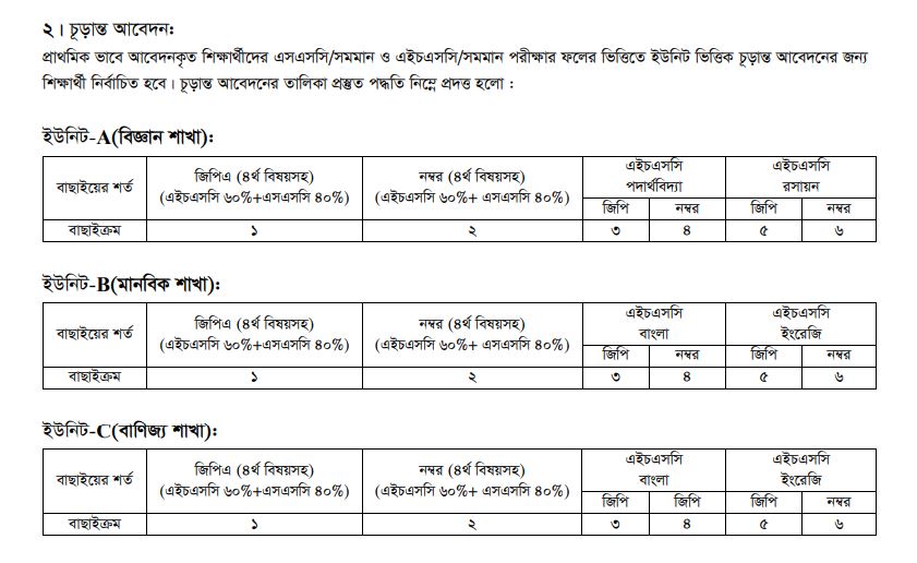 তথ্যমতে, প্রাথমিকভাবে আবেদন থেকে ৬টি ক্রাইটেরিয়া ক্রমানুসারে ব্যবহার করে চূড়ান্ত মেধাক্রম প্রস্তুত করা হবে। তারাই এই ভর্তি পরীক্ষায় বসতে পারবে। এ ক্ষেত্রে শিক্ষার্থীদের প্রথমে এসএসসি ও এইচএসসির প্রাপ্ত জিপিএ ও নম্বর, বিজ্ঞান শাখার এইচএসসিতে যথাক্রমে পদার্থ ও রসায়ন বিষয়ে জিপিএ ও নম্বর এবং মানবিক ও বাণিজ্য শাখার ক্ষেত্রে এসএসসি ও এইচএসসির জিপিএ ও নম্বর, এইচএসসিতে বাংলা ও ইংরেজি বিষয়ে জিপিএ ও নম্বর ব্যবহার করে মেধাক্রম প্রস্তুত করতে হবে। প্রতিটি ইউনিটে সর্বোচ্চ দেড় লাখ বিশ্ববিদ্যালয়ে ভর্তিচ্ছু ভর্তি পরীক্ষায় অংশ নিতে পারবেন।