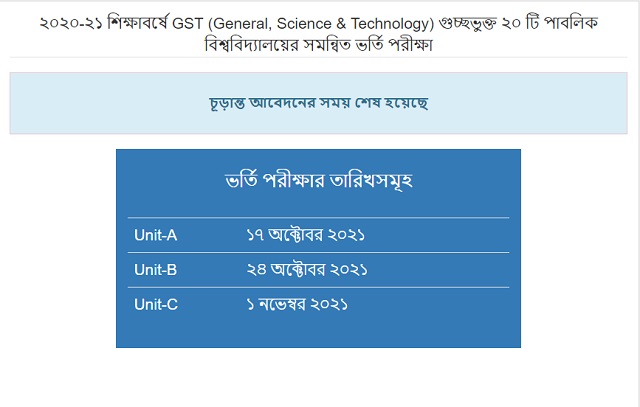 মঙ্গলবার (২১ সেপ্টেম্বর) গুচ্ছ ভর্তি পরীক্ষায় অংশ নেওয়া ২০ বিশ্ববিদ্যালয়ের উপাচার্যদের সমন্বয়ে গঠিত কোর কমিটির সভায় এই সিদ্ধান্ত নেওয়া হয়েছে। এদিকে, আজ বুধবার (২২ সেপ্টেম্বর) গুচ্ছ ভর্তির ওয়েবসাইটে (https://gstadmission.ac.bd/) বিজ্ঞপ্তি দিয়ে আনুষ্ঠানিকভাবে এই ভর্তি পরীক্ষার তারিখ জানিয়ে দেওয়া হয়েছে।