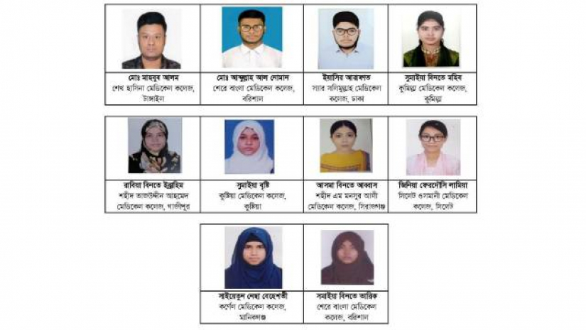 ২০২১-২২ শিক্ষাবর্ষে সরকারি মেডিকেল কলেজে সুযোগ পাওয়া শিক্ষার্থীরা হলেন মো. মাহবুব আলম (শেখ হাসিনা মেডিকেল কলেজ, টাঙ্গাইল), মো. আব্দুল্লাহ আল নোমান (শেরেবাংলা মেডিকেল কলেজ, বরিশাল), ইয়াসির আরাফাত (স্যার সলিমুল্লাহ মেডিকেল কলেজ, ঢাকা), সুমাইয়া বিনতে মহিব (কুমিল্লা মেডিকেল কলেজ), রাবিয়া বিনতে ইব্রাহিম (শহীদ তাজউদ্দীন আহমদ মেডিকেল কলেজ, গাজীপুর), সুমাইয়া বৃষ্টি (কুষ্টিয়া মেডিকেল কলেজ), আসমা বিনতে আব্বাস (শহীদ এম মনসুর আলী মেডিকেল কলেজ, সিরাজগঞ্জ), জিনিয়া ফেরদৌসি লামিয়া (সিলেট ওসমানী মেডিকেল কলেজ), সাইয়েতুন নেছা বেহেশতী (কর্নেল মালেক মেডিকেল কলেজ, মানিকগঞ্জ), সমাইয়া বিনতে তারিক (শেরেবাংলা মেডিকেল কলেজ, বরিশাল)।