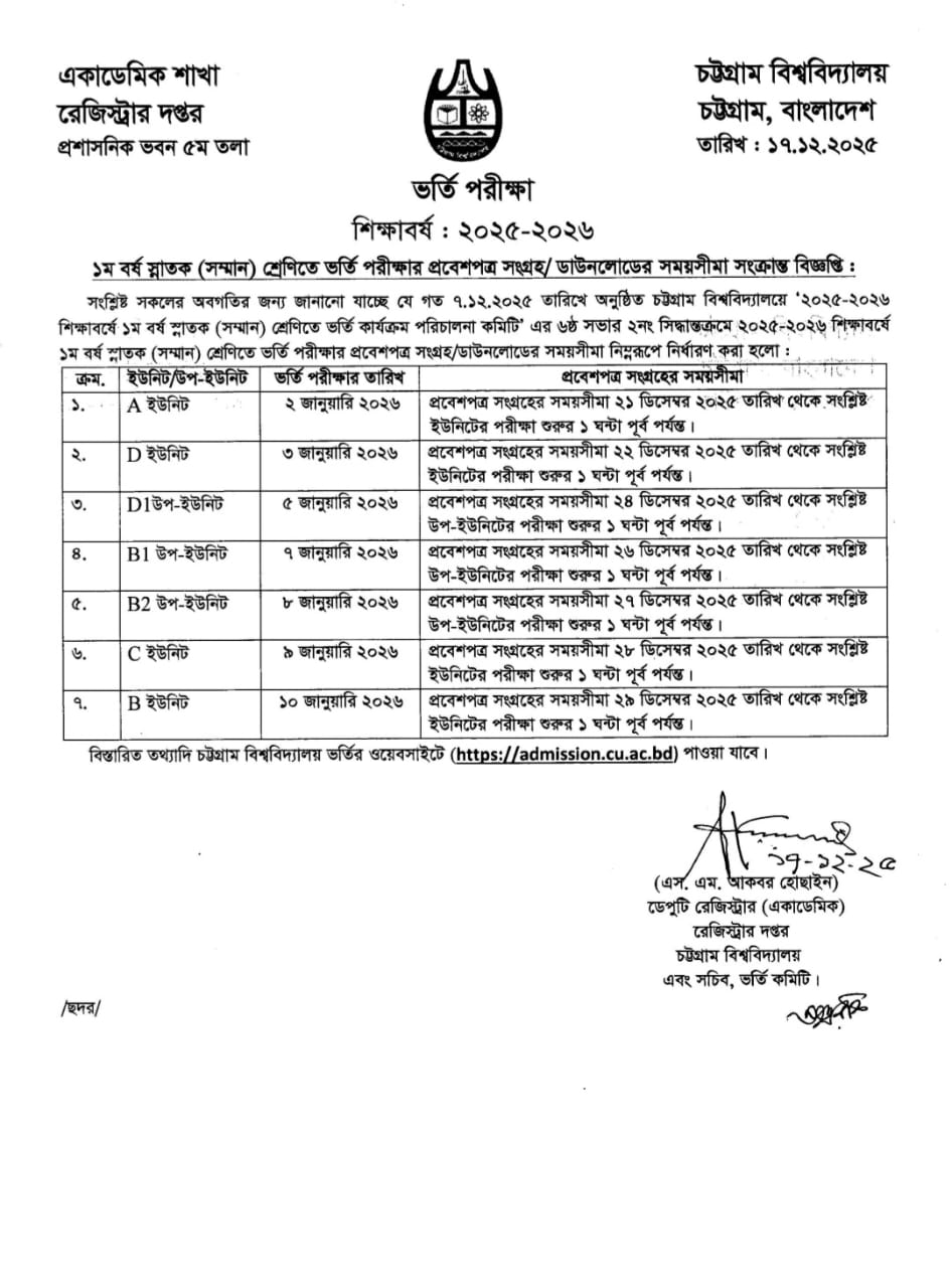 ২০২৫-২৬ শিক্ষাবর্ষে চট্টগ্রাম বিশ্ববিদ্যালয়ের স্নাতক প্রথমবর্ষের ভর্তি পরীক্ষার ৭ ইউনিটের প্রবেশপত্র ডাউনলোডের সময়সীমা প্রকাশ করা হয়েছে। বুধবার (১৭ ডিসেম্বর) বিশ্ববিদ্যালয়ের ডেপুটি রেজিস্ট্রার ও ভর্তি কমিটির সচিব এস. এম. আকবর হোছাইন স্বাক্ষরিত এক বিজ্ঞপ্তিতে এ তথ্য জানানো হয়েছে।