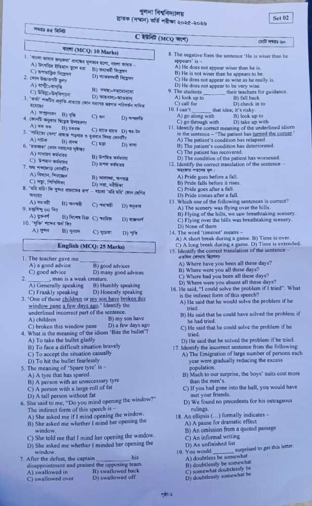 খুলনা বিশ্ববিদ্যালয়ের ‘সি’ ইউনিট পরীক্ষা শেষ, প্রশ্ন দেখুন