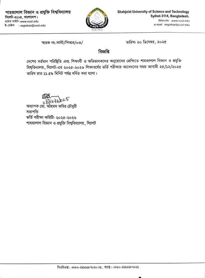 সিলেটের শাহজালাল বিজ্ঞান ও প্রযুক্তি বিশ্ববিদ্যালয়ের (শাবিপ্রবি) ২০২৫-২০২৬ শিক্ষাবর্ষের ভর্তি পরীক্ষার আবেদনের সময় পাঁচ দিন বাড়ানো হয়েছে। শনিবার (২০ ডিসেম্বর) ভর্তি কমিটির সভাপতি অধ্যাপক মো. আহমদ কবির চৌধুরী স্বাক্ষরিত এক বিজ্ঞপ্তিতে এ তথ্য জানানো হয়েছে।