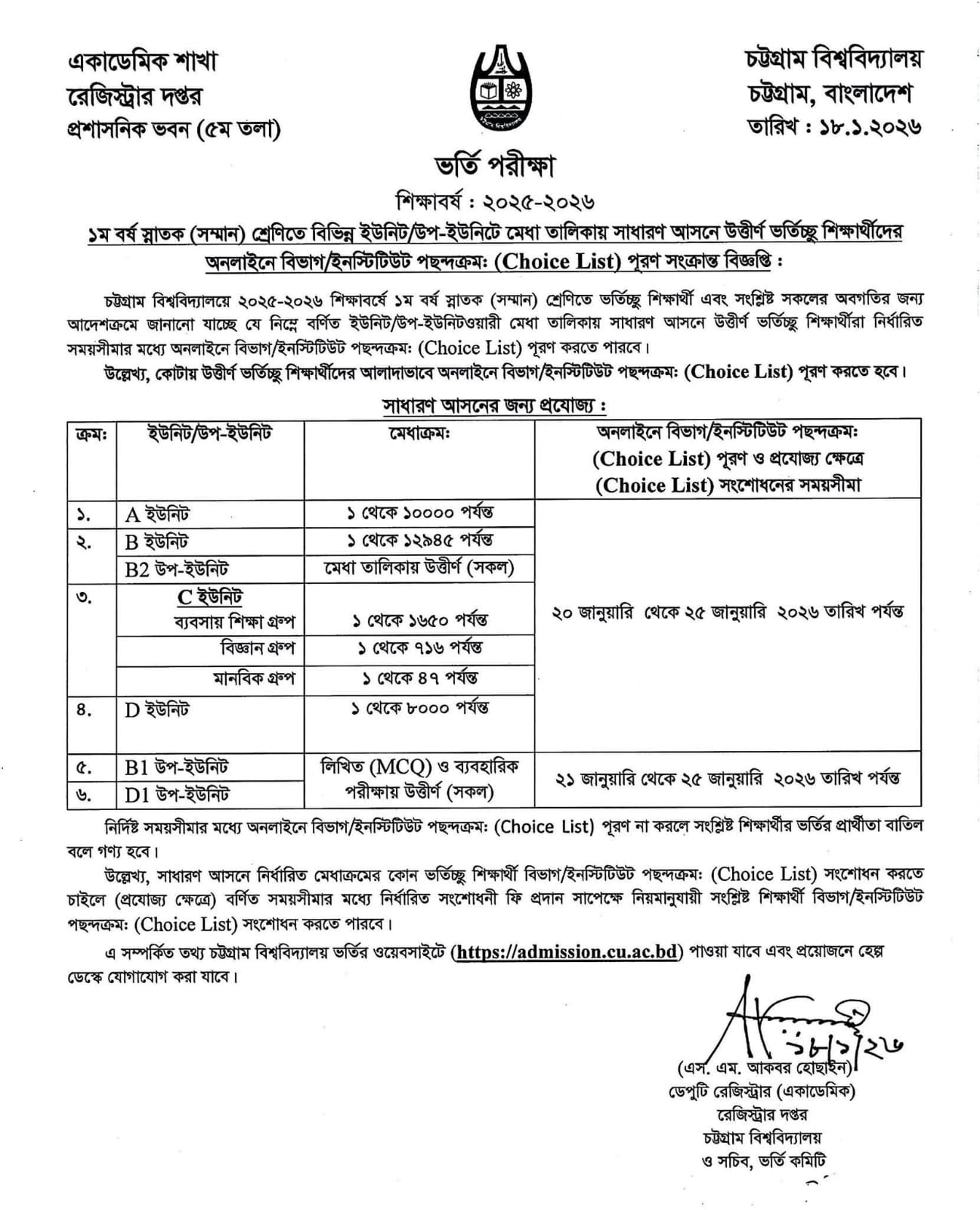 চট্টগ্রাম বিশ্ববিদ্যালয়ের ২০২৫–২০২৬ শিক্ষাবর্ষে প্রথম বর্ষ স্নাতক (সম্মান) ভর্তি পরীক্ষায় উত্তীর্ণ শিক্ষার্থীদের জন্য চয়েস লিস্ট পূরণের সময়সূচি ঘোষণা করা হয়েছে। রবিবার (১৮ জানুয়ারি) বিশ্ববিদ্যালয় প্রশাসনের জারি করা এক বিজ্ঞপ্তিতে এ তথ্য জানানো হয়।