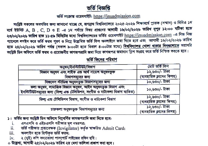 বিজ্ঞপ্তিতে বলা হয়, জগন্নাথ বিশ্ববিদ্যালয়ে ২০২৫-২৬ শিক্ষাবর্ষে স্নাতক (সম্মান) ও বিবিএ ১ম বর্ষে ইউনিট ‘এ, বি, সি, ডি ও ই’-এ ১ম পর্যায়ে বিষয় প্রাপ্তদের ১৯ ফেব্রুয়ারি দুপুর ১২টা থেকে ২৩ ফেব্রুয়ারি রাত ১১টা ৫৯ মিনিটের মধ্যে বিশ্ববিদ্যালয়ের ভর্তির ওয়েবসাইটে https://jinuadmission.com-এ নিজ নিজ প্যানেলে লগইন করে ভর্তি ফরম পূরণ ও নিম্নে উল্লেখিত ভর্তি ফিস অনলাইনে জমা দিতে হবে।