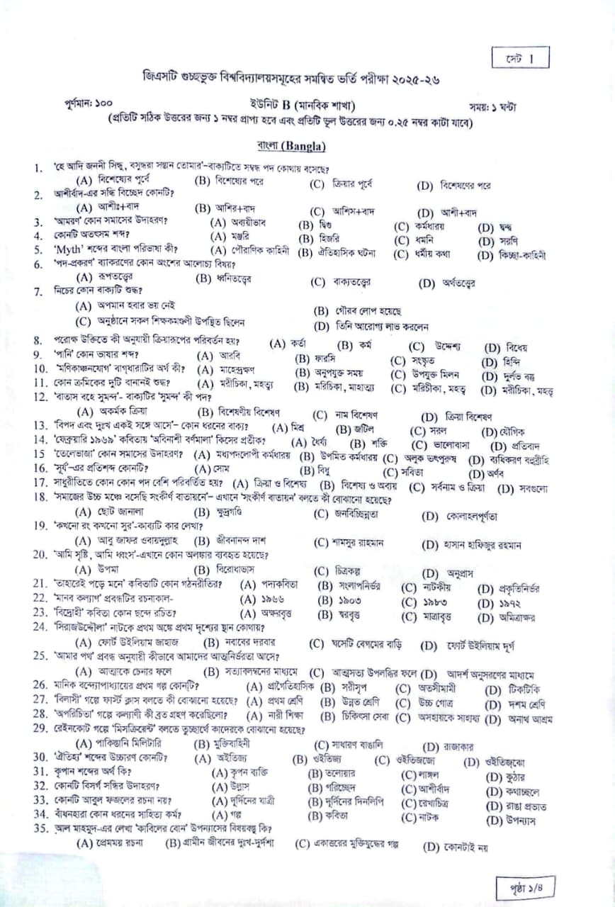 ২০২৫-২৬ শিক্ষাবর্ষে গুচ্ছভুক্ত (জিএসটি) পদ্ধতিতে ২০টি সাধারণ এবং বিজ্ঞান ও প্রযুক্তি বিশ্ববিদ্যালয় গুলোর স্নাতক প্রথম বর্ষের ‘বি’ (মানবিক) ইউনিটের ভর্তি পরীক্ষা অনুষ্ঠিত হয়ে। বরাবরের ন্যায় এবারেও এমসিকিউ পদ্ধতিতেই ভর্তি পরীক্ষা গ্রহণ করা হয়েছে। এদিন সকাল ১১ টা থেকে দুপুর ১২টা পর্যন্ত ১ ঘন্টা সময়ে সারাদেশের মোট ২১টি কেন্দ্রে ১০০ নম্বরেরি এমসিকিউ পদ্ধতিতে পরীক্ষা অনুষ্ঠিত হয়।