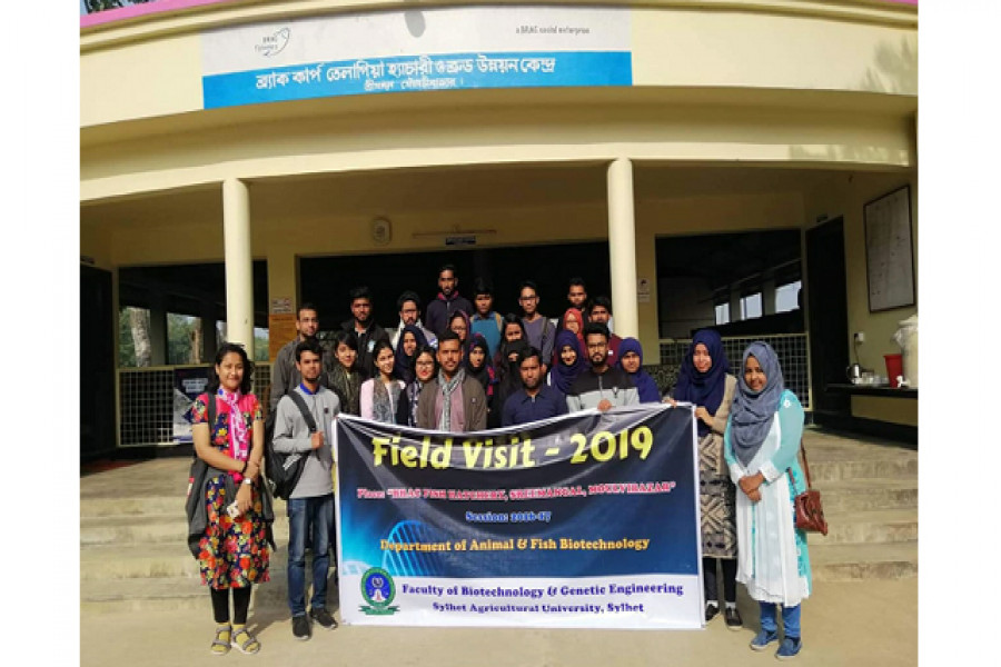 মৌলভীবাজার জেলার শ্রীমঙ্গলে অবস্থিত ব্র্যাক ফিশ হ্যাচারি পরিদর্শন করেছে সিলেট কৃষি বিশ্ববিদ্যালয়ের (সিকৃবি) বায়োটেকনোলজি অ্যান্ড জেনেটিক ইঞ্জিনিয়ারিং অনুষদের তৃতীয় বর্ষের শিক্ষার্থীবৃন্দ। মঙ্গলবার মাঠ সফরে সিলেট কৃষি বিশ্ববিদ্যালয়ের এনিম্যাল অ্যান্ড ফিশ বায়োটেকনোলজি বিভাগের আয়োজনে বায়োটেকনোলজি অ্যান্ড জেনেটিক ইঞ্জিনিয়ারিং অনুষদের লেভেল ৩ সেমিস্টার ২ এর ২১ জন শিক্ষার্থী মাঠ পরিদর্শনে অংশ নেয়।