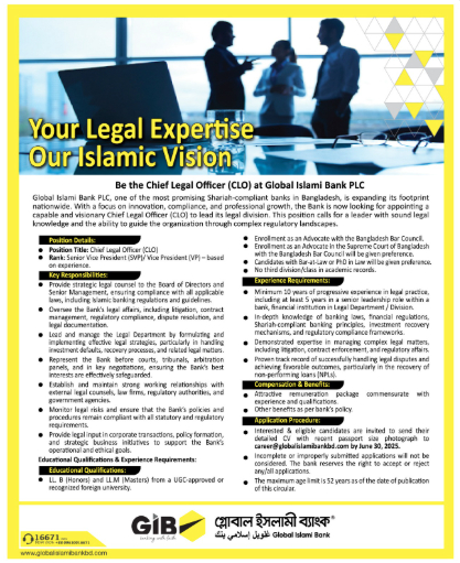আগ্রহী প্রার্থীরা career@globalislamibankbd.com ঠিকানায় সিভি পাঠিয়ে আবেদন সম্পন্ন করতে পারবেন;