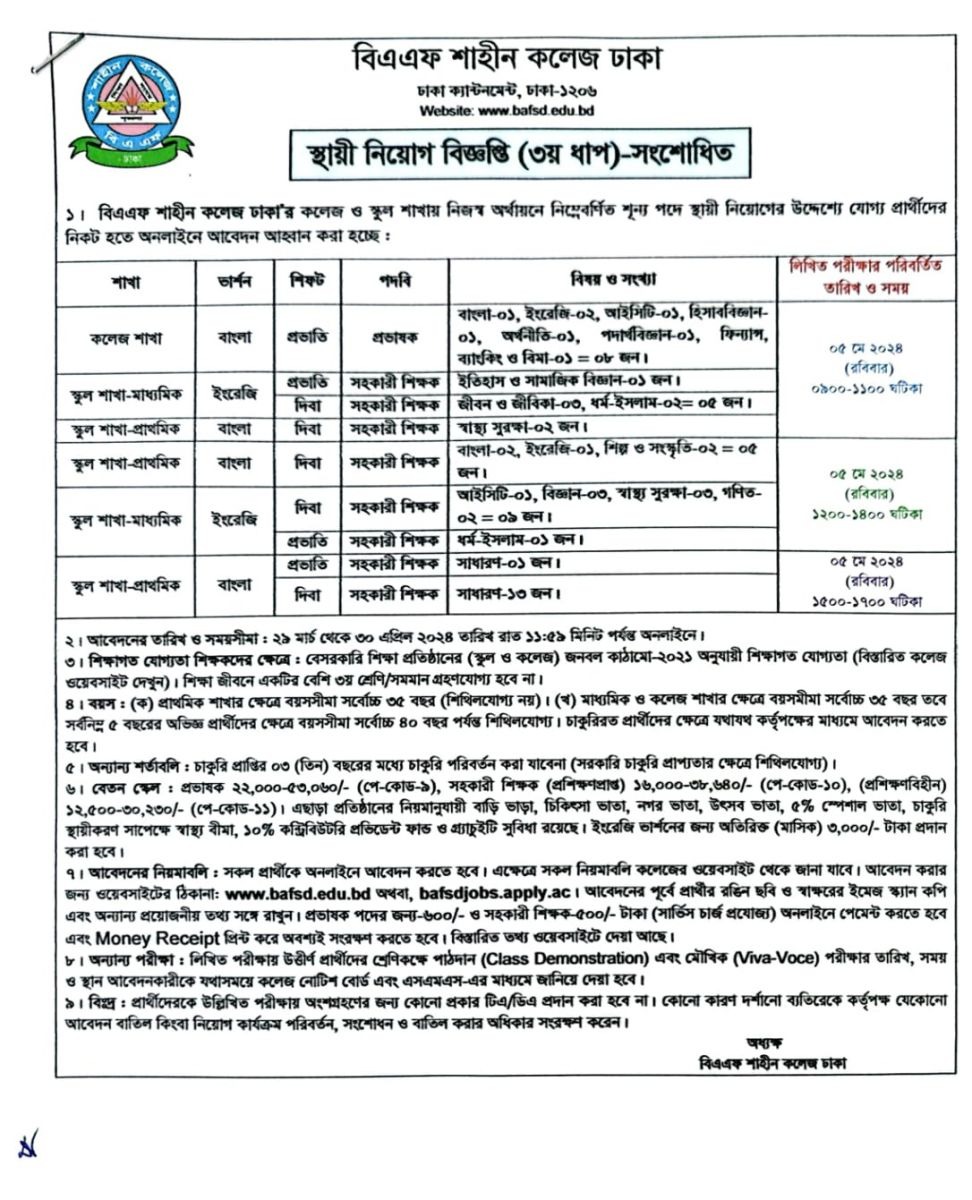 নিয়োগ বিজ্ঞপ্তি প্রকাশ করেছে বিএএফ শাহীন কলেজ ঢাকা। প্রতিষ্ঠানটি ‘প্রভাষক এবং সহকারী শিক্ষক’ পদে ৪৫ জনকে নিয়োগ দেবে। আগ্রহীরা আগামী ৩০ এপ্রিল পর্যন্ত আবেদন করতে পারবেন।