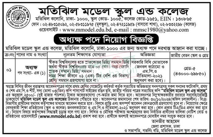 রাজধানীর মতিঝিল মডেল স্কুল অ্যান্ড কলেজ শিক্ষক নিয়োগে বিজ্ঞপ্তি প্রকাশ করেছে। প্রতিষ্ঠানটি ‘অধ্যক্ষ’ পদে নিয়োগ দিতে প্রকাশ করে এ বিজ্ঞপ্তি। আগ্রহী প্রার্থীরা আগামী ৩০ অক্টোবরের মধ্যে আবেদন করতে পারবেন।