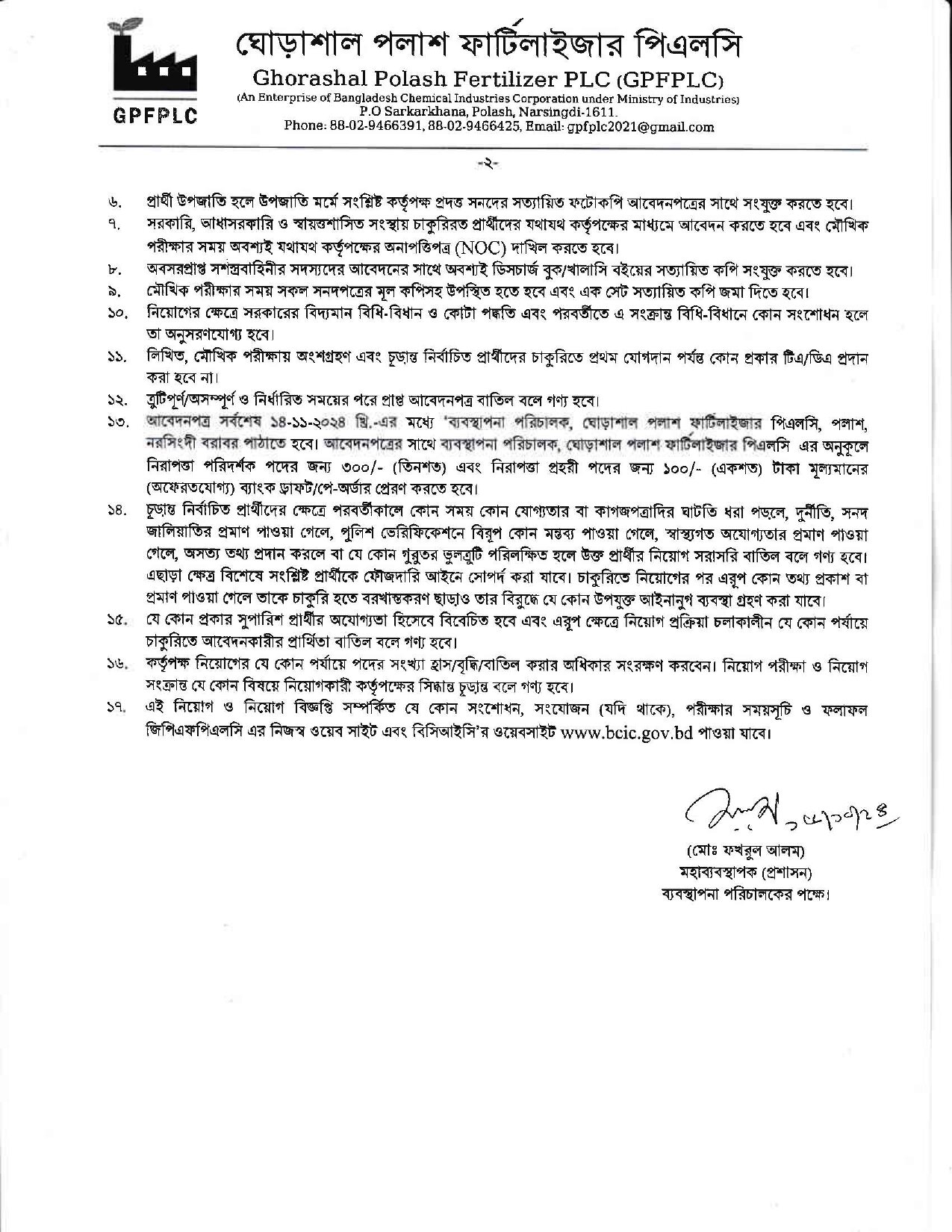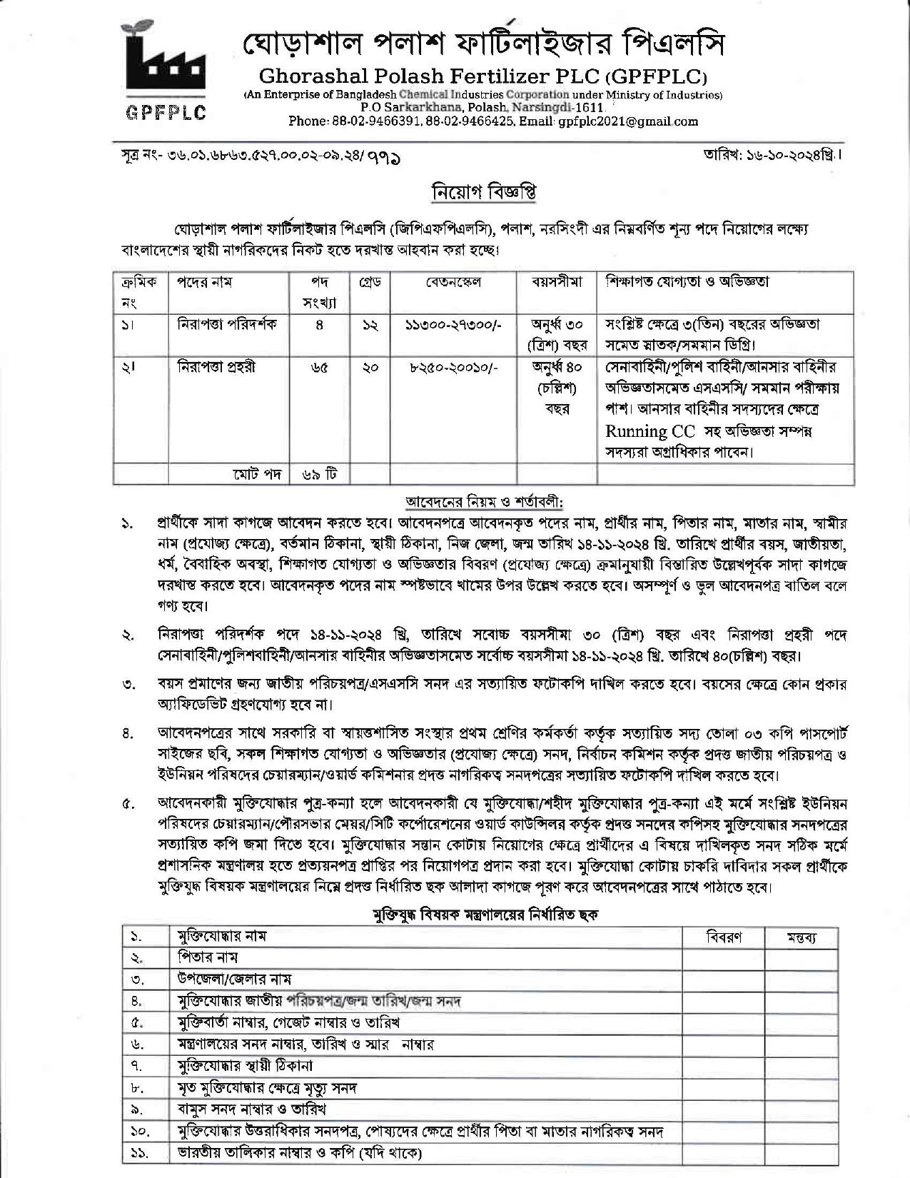 আবেদন ফি বাবদ নিরাপত্তা পরিদর্শক পদের জন্য ৩০০ এবং নিরাপত্তা প্রহরী পদের জন্য ১০০ টাকা পে-অর্ডার/ব্যাংক ড্রাফট ব্যবস্থাপনা পরিচালক, ঘোড়াশাল পলাশ ফার্টিলাইজার পিএলসি, পলাশ, নরসিংদী বরাবর পাঠাতে হবে।