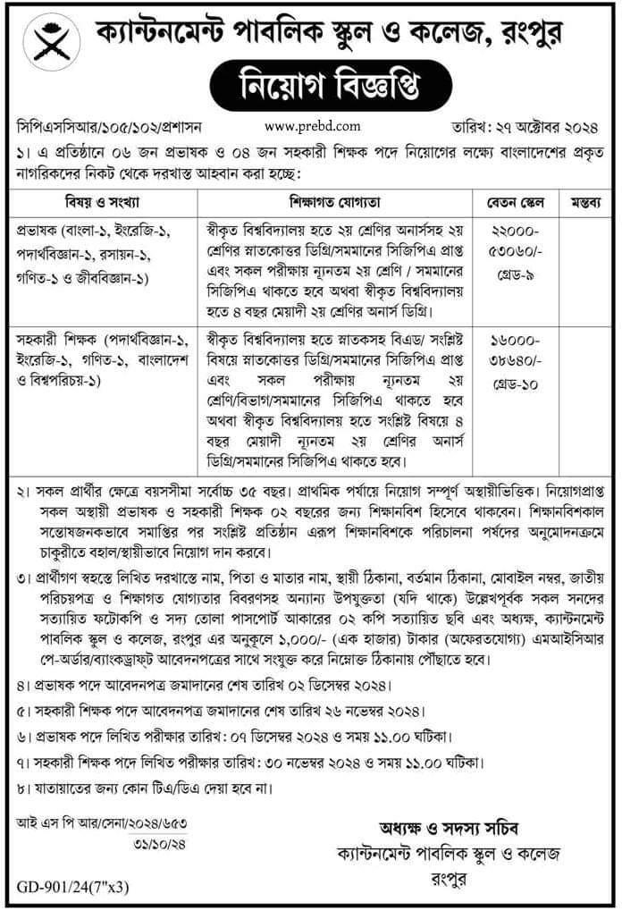 ক্যান্টনমেন্ট পাবলিক স্কুল ও কলেজ রংপুরে চাকরি, বয়স ৩৫ পর্যন্ত আবেদন