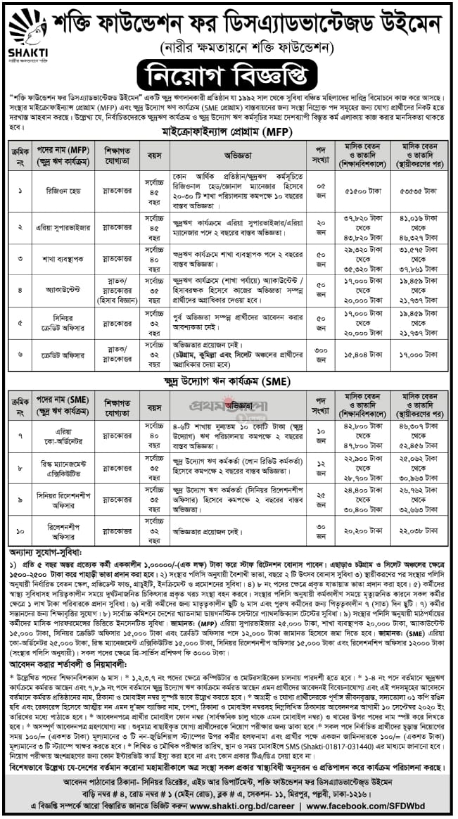 ক্ষুদ্র ঋণদানকারী প্রতিষ্ঠান শক্তি ফাউন্ডেশন ফর ডিসঅ্যাডভান্টেজ উইমেন বিভিন্ন পদে বাংলাদেশের যেকোন জেলা শহর বা গ্রামাঞ্চলে কাজ করতে আগ্রহীদের নিকট থেকে দরখাস্ত আহবান করেছে।