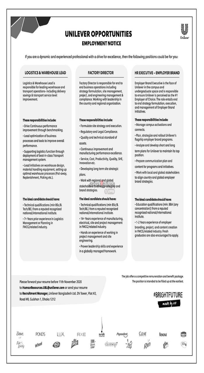 তিনটি পদের জন্য নিয়োগ বিজ্ঞপ্তি প্রকাশ করেছে দেশের শীর্ষস্থানীয় বহুজাতিক কোম্পানী ইউনিলিভার। প্রতিটি পদের জন্য যোগ্যতা চাওয়া হয়েছে স্নাতক পাস। তবে তিনটি পদের জন্য আলাদা আলাদা অভিজ্ঞতা চাওয়া হয়েছে।