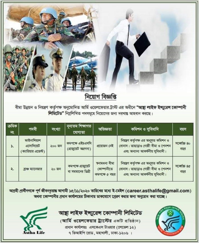 আবেদনের শেষ তারিখ: আগ্রহী প্রার্থীগণকে পূর্ণ জীবনবৃত্তান্ত আগামী ১৫ নভেম্বরের মধ্যে ই-মেইলে (career.asthalife@gmail.com) পাঠাতে হবে। অথবা কোম্পানীর প্রধান কার্যালয়ের ঠিকানায় ডাকযােগে প্রেরণ করার জন্য অনুরােধ করা হয়েছে।