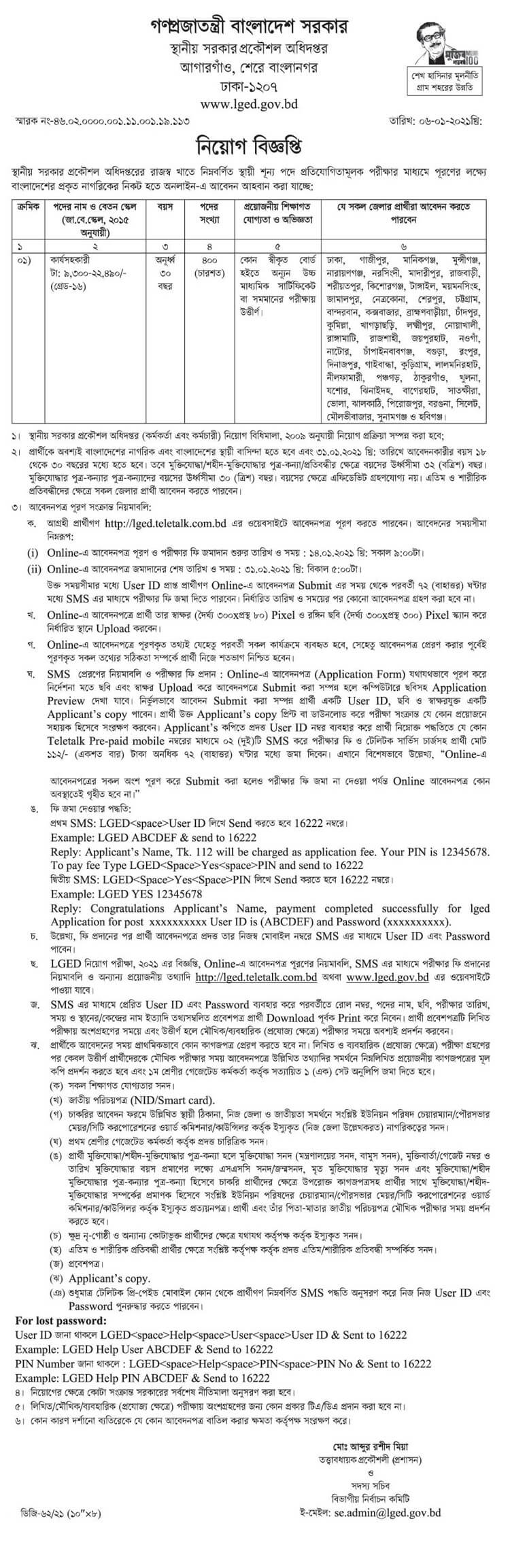 আগ্রহী প্রার্থীরা অনলাইনের মাধ্যমে আবেদন করতে পারবেন। আবেদনের ওয়েবসাইট http://lged.teletalk.com.bd ।