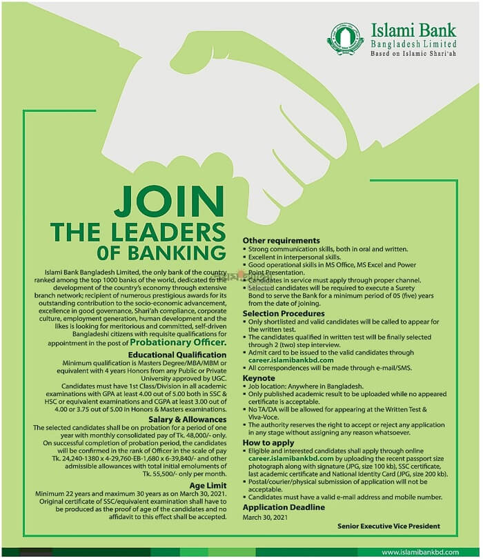 আবেদন করতে হবে ওয়েবসাইটের (http://career.islamibankbd.com/career.php) মাধ্যমে। আগামী ৩০ মার্চ পর্যন্ত আবেদন করা যাবে।