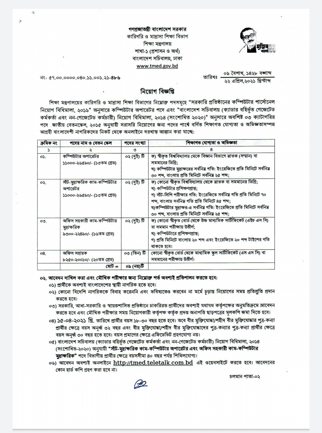 নিয়োগ বিজ্ঞপ্তি প্রকাশ করেছে শিক্ষা মন্ত্রণালয়ের কারিগরি ও মাদ্রাসা শিক্ষা বিভাগ। আগামী ২৬ এপ্রিল থেকে আবেদন শুরু হয়ে চলবে ২৫ মে পর্যন্ত।