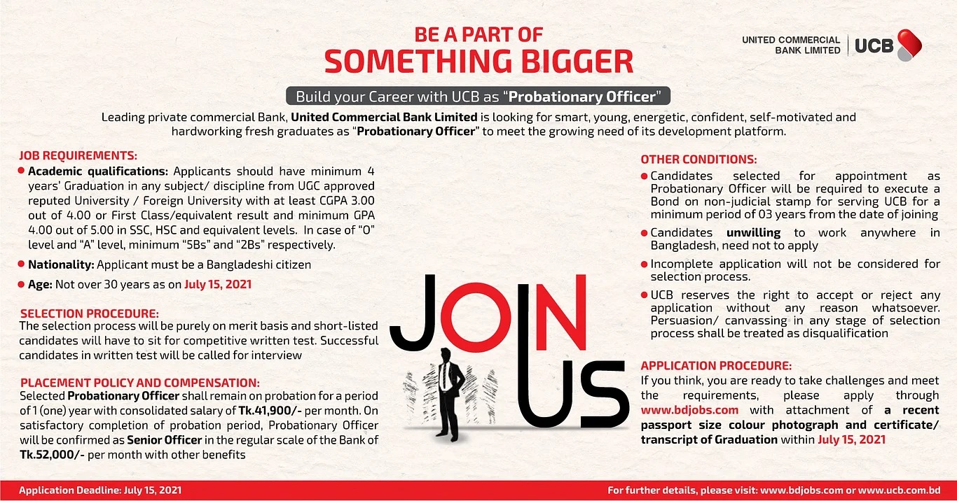 প্রবেশনারি অফিসার পদে জনবল নিয়োগ দিতে বিজ্ঞপ্তি প্রকাশ করেছে বেসরকারি ইউনাইটেড কমার্শিয়াল ব্যাংক লিমিটেড (ইউসিবি)। বিজ্ঞপ্তি অনুসারে যোগ্যতা পূরণ সাপেক্ষে আগ্রহীরা অনলাইনে আবেদন করতে পারবেন।