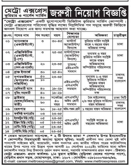 জনবল নিয়োগের বিজ্ঞপ্তি প্রকাশ করেছে কুরিয়ার ও পার্সেল সার্ভিস “মেট্রো এক্সপ্রেস”। প্রতিষ্ঠানটির ১৪ পদে মোট ৩৭৯ জনকে নিয়োগ দেওয়া হবে। আগ্রহী প্রার্থীদের আগামী ২০ সেপ্টেম্বরের মধ্যে আবেদন করতে হবে।