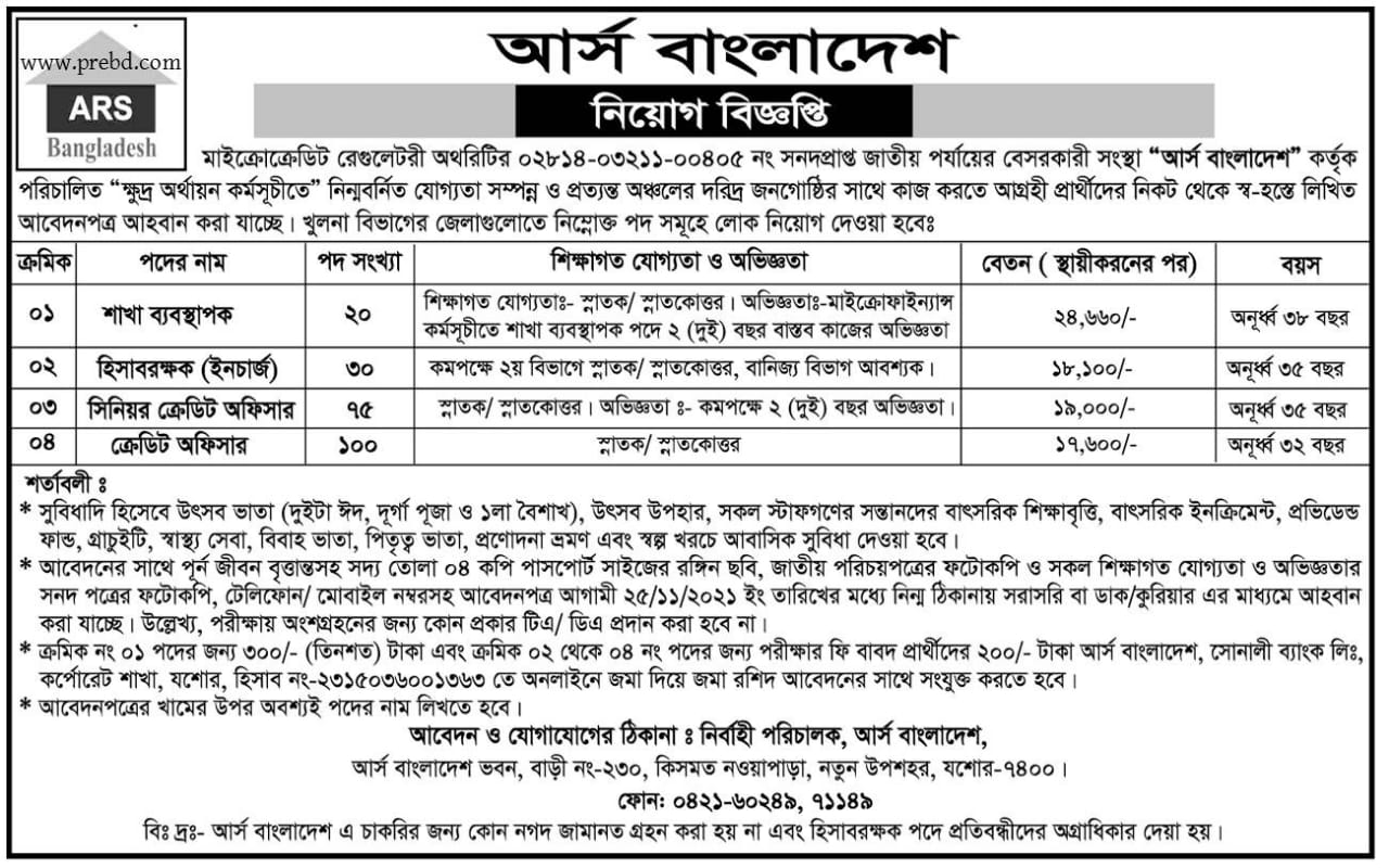 আবেদন প্রেরণের ঠিকানা: নির্বাহী পরিচালক, আর্স বাংলাদেশ, আর্স বাংলাদেশ ভবন, বাড়ী নং-২৩০, কিসমত নওয়াপাড়া, নতুন উপশহর, যশোর-৭৪০০