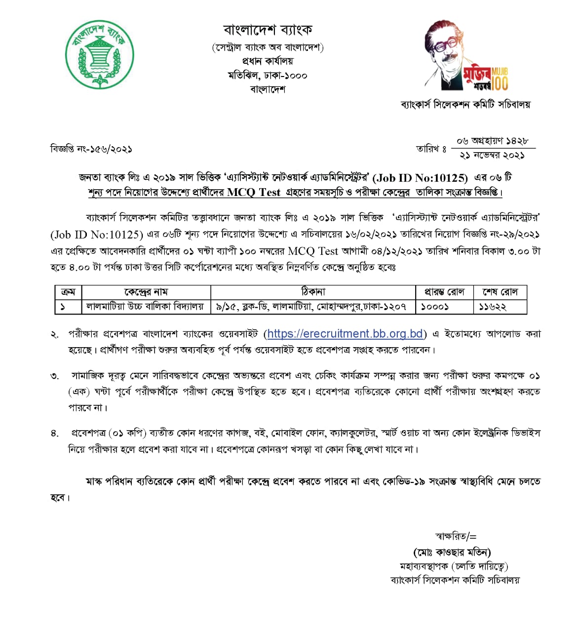 রাজধানীর মোহাম্মাদপুরের লালমাটিয়া উচ্চ বালিকা বিদ্যালয়ে এ পরীক্ষা অনুষ্ঠিত হবে। পরীক্ষার প্রবেশপত্র বাংলাদেশ ব্যাংকের ওয়েবসাইটে (https://erecruitment.bb.org.bd) থেকে ডাউনলোড করা যাবে।