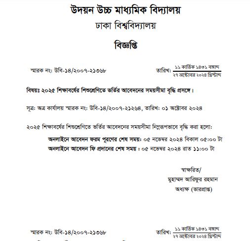 নতুন সময়সীমা অনুযায়ী অনলাইনে ভর্তিতে আবেদনের শেষ সময় আগামী ৫ নভেম্বর ২০২৪, বিকেল ৫টা এবং অনলাইনে আবেদন ফি জমাদানের শেষ সময় একই দিন অর্থাৎ ৫ নভেম্বর রাত ১১টা।