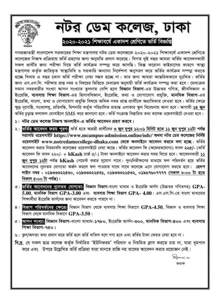 কাল থেকে শিক্ষার্থী ভর্তির আবেদন শুরু করবে নটরডেম কলেজে। করোনাভাইরাসের কারণে এবার ভর্তি পরীক্ষা ছাড়াই জিপিএ’র ভিত্তিতে ভর্তি কার্যক্রম সম্পন্ন করবে কলেজ কর্তৃপক্ষ। ইতোমধ্যেই এ সংক্রান্ত বিজ্ঞপ্তি প্রকাশ করেছে কলেজটি।