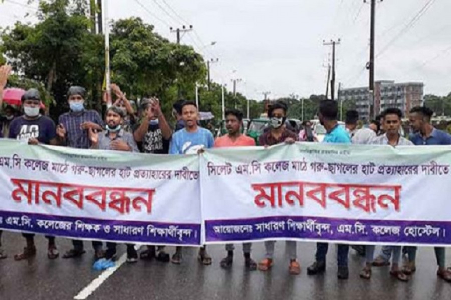 সিলেটের ঐতিহ্যবাহী মুরারীচাঁদ কলেজের (এমসি কলেজ) মাঠে কোরবানির পশুর হাট দেয়ার প্রতিবাদে শিক্ষার্থীদের আন্দোলন অব্যাহত রয়েছে। গতকাল সোমবার তারা কলেজের মাঠের সামনে মানববন্ধন কর্মসূচি পালন করে। এসময় তারা বালুচর-টিলাগড় সড়ক প্রায় এক ঘণ্টা অবরোধ করে বিক্ষোভও করেন।