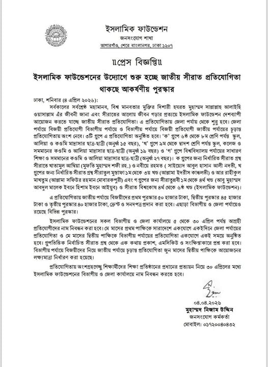 সর্বকালের সর্বশ্রেষ্ঠ মহামানব, বিশ্ব মানবতার মুক্তির দিশারী হযরত মুহাম্মদ (সা.)-এঁর জীবনী জানা ও সীরাতের আলোয় জীবন গড়ার প্রত্যয়ে ইসলামিক ফাউন্ডেশন দেশব্যাপী আয়োজন করতে যাচ্ছে জাতীয় সীরাত প্রতিযোগিতা।