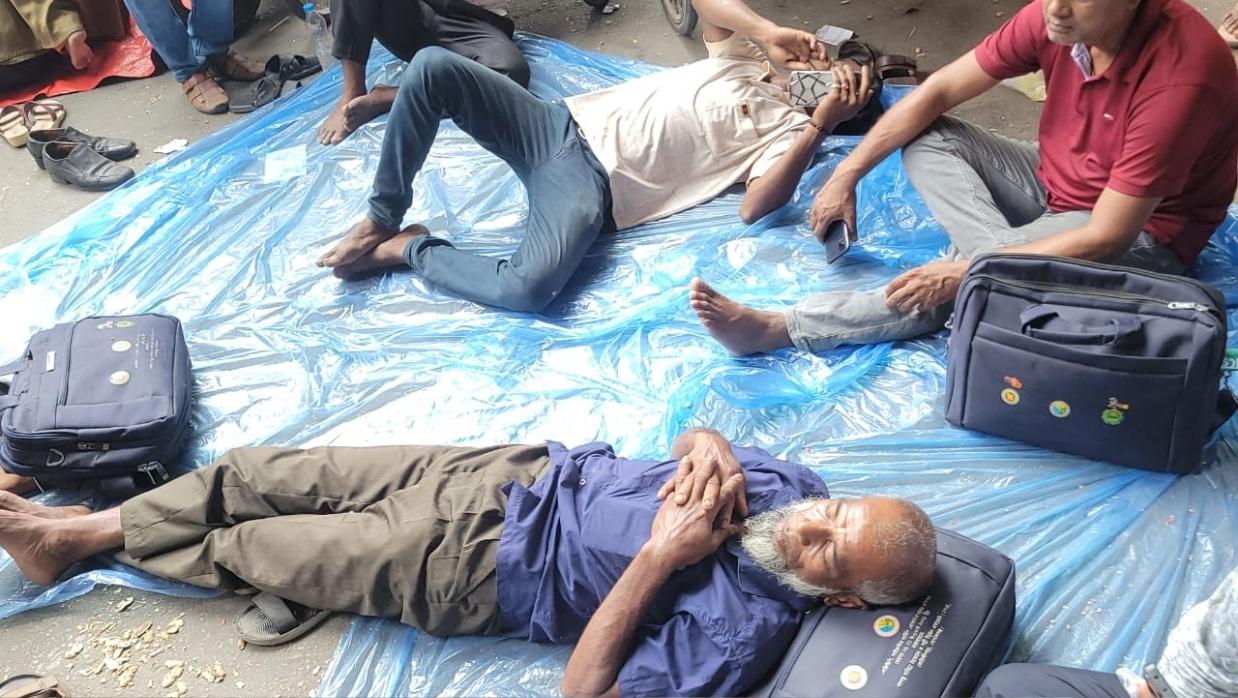 চাকরি স্থায়ীকরণের দাবিতে অবস্থান কর্মসূচি পালন করছেন এলএসপি কর্মীরা। © টিডিসি ফটো