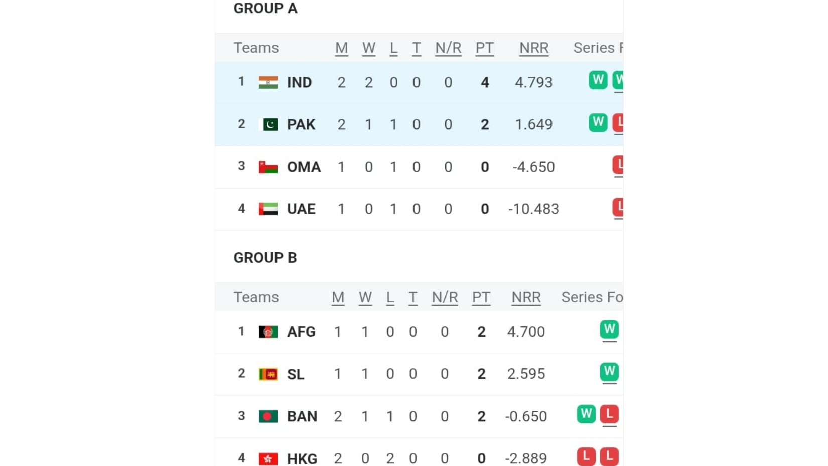 এই গ্রুপের অন্য দুই দল ওমান ও সংযুক্ত আরব আমিরাত। তবে একটি করে ম্যাচ খেললেও এখনো জয়ের স্বাদ নিতে পারেনি দল দুটি। প্রথম জয়ের স্বাদ নিতে আজ (১৫ সেপ্টেম্বর) সন্ধ্যা ৬টায় মুখোমুখি হচ্ছে তারা। সেই হিসেবে বড় কোনো অঘটন না ঘটলে এই গ্রুপ থেকে ভারত ও পাকিস্তানই সুপার ফোরে জায়গা পেতে যাচ্ছে।