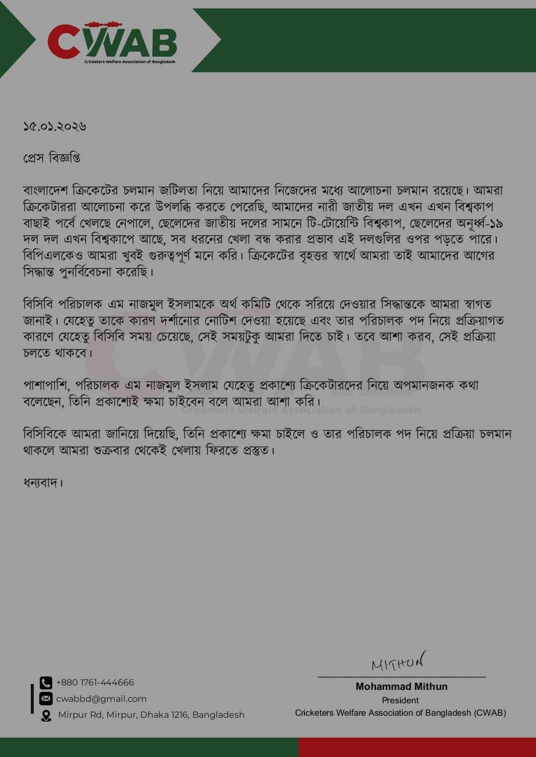 কোয়াব আরও জানিয়েছে, এম নাজমুল ইসলাম প্রকাশ্যে ক্ষমা চাইলে এবং তার পরিচালক পদ সংক্রান্ত প্রক্রিয়া চলমান থাকলে শুক্রবার থেকেই ক্রিকেটাররা মাঠে ফেরার জন্য প্রস্তুত। এর মাধ্যমে বিপিএলসহ দেশের ক্রিকেট ফের স্বাভাবিক হওয়ার পথ তৈরি হলো বলে মনে করছেন সংশ্লিষ্টরা।