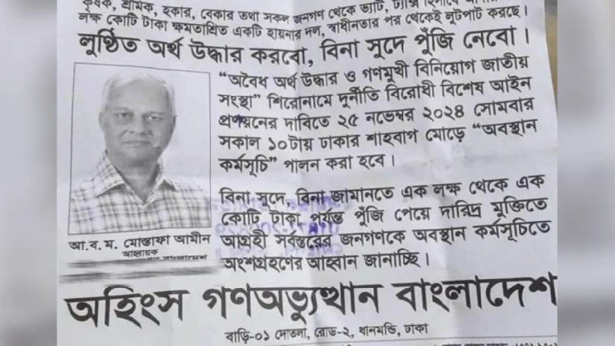 ঢাকায় আসা মানুষের কাছে অহিংস গণঅভ্যুত্থান বাংলাদেশ সংগঠনের ব্যানার, ফেস্টুন ও লিফলেট পাওয়া যায়। তাদের হাতে ফেস্টুনে লেখা ছিল, ‘লুণ্ঠিত অর্থ উদ্ধার করব, বিনা সুদে পুঁজি নেব’।