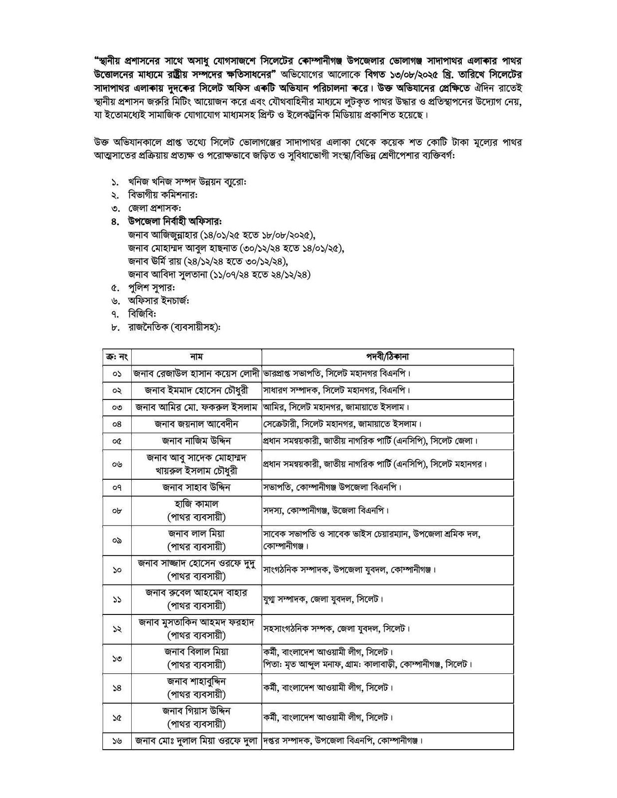 সিলেটের কোম্পানীগঞ্জ উপজেলার ভোলাগঞ্জ পাথর কোয়ারির সাদা পাথর লুটের ঘটনায় প্রাথমিক অনুসন্ধান চালিয়েছে দুর্নীতি দমন কমিশনের (দুদক)। প্রতিবেদনে প্রশাসনের লোকজন ছাড়াও পাথর লুটে প্রত্যক্ষ ও পরোক্ষভাবে স্থানীয় বিএনপি, জামায়াত, আওয়ামী লীগ, এনসিপিসহ ৪২ জন রাজনীতিবিদ ও ব্যবসায়ীর নাম উল্লেখ করা হয়েছে।