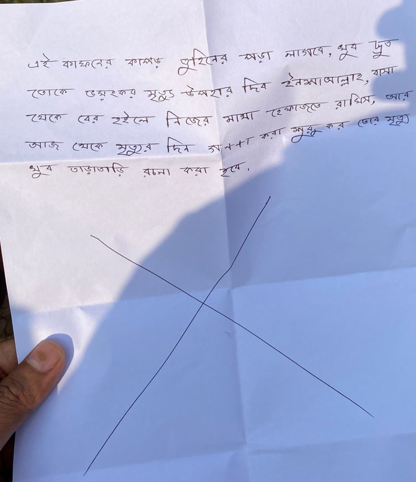 হুমকি দিয়ে পাঠানো চিরকুটে লেখা হয়েছে, ‘এই কাফনের কাপড় তুহিনের পরা লাগবে, খুব দ্রুত বাসা তোকে ভয়ংকর মৃত্যু উপহার দিব ইনশাআল্লাহ,’ বাসা থেকে বের হইলে নিজের মাথা হেফাজতে রাখিস, আর আজ থেকে মৃত্যুর দিন গণনা শুরু কর। তোর মৃত্যু খুব তাড়াতাড়ি রচনা করা হবে।