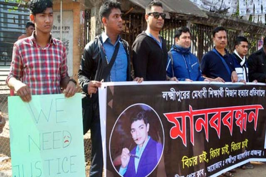 মেধাবী শিক্ষার্থী মিজানুর রহমান মিজানের হত্যাকারীদের দ্রুত গ্রেফতার এবং দৃষ্টান্তমূলক শাস্তির দাবিতে মানববন্ধন করেছে লক্ষ্মীপুর আলোকিত প্রজন্ম। শুক্রবার ( ১৭ জানুয়ারি) সকালে জাতীয় প্রেসক্লাবের সামনে এ মানববন্ধন করা হয়।