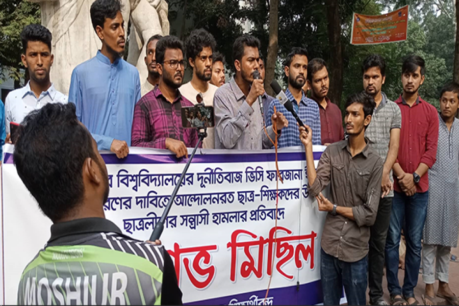জাহাঙ্গীরনগর বিশ্ববিদ্যালয়ের (জাবি) উপাচার্যবিরোধী আন্দোলনকারীদেরে উপর হামলার প্রতিবাদে বিক্ষোভ মিছিল করেছেন ঢাকা বিশ্ববিদ্যালয়ের সাধারণ শিক্ষার্থীরা। পূর্বঘোষিত কর্মসূচী অনুযায়ী ঢাকা বিশ্ববিদ্যালয় কেন্দ্রীয় ছাত্র সংসদের (ডাকসু) ভিপি নুরুল হকের নেতৃত্বে এ বিক্ষোভ মিছিল বের করা হয়।