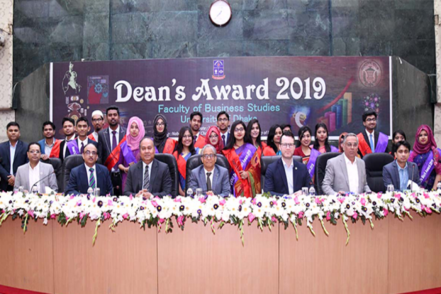 ঢাকা বিশ্ববিদ্যালয়ের ব্যবসায় শিক্ষা অনুষদের বিভিন্ন বিভাগে বিবিএ এবং এমবিএ পরীক্ষায় অসাধারণ ফলাফল অর্জন করায় ৬৯ শিক্ষার্থীকে ডিনস্ অ্যাওয়ার্ড প্রদান করা হয়েছে। রবিবার ঢাকা বিশ্ববিদ্যালয়ের নবাব নওয়াব আলী চৌধুরী সিনেট ভবনে আয়োজিত এক বর্ণাঢ্য অনুষ্ঠানে প্রধান অতিথি হিসেবে উপস্থিত থেকে উপাচার্য অধ্যাপক ড. মো. আখতারুজ্জামান কৃতী শিক্ষার্থীদের হাতে অ্যাওয়ার্ড তুলে দেন।
