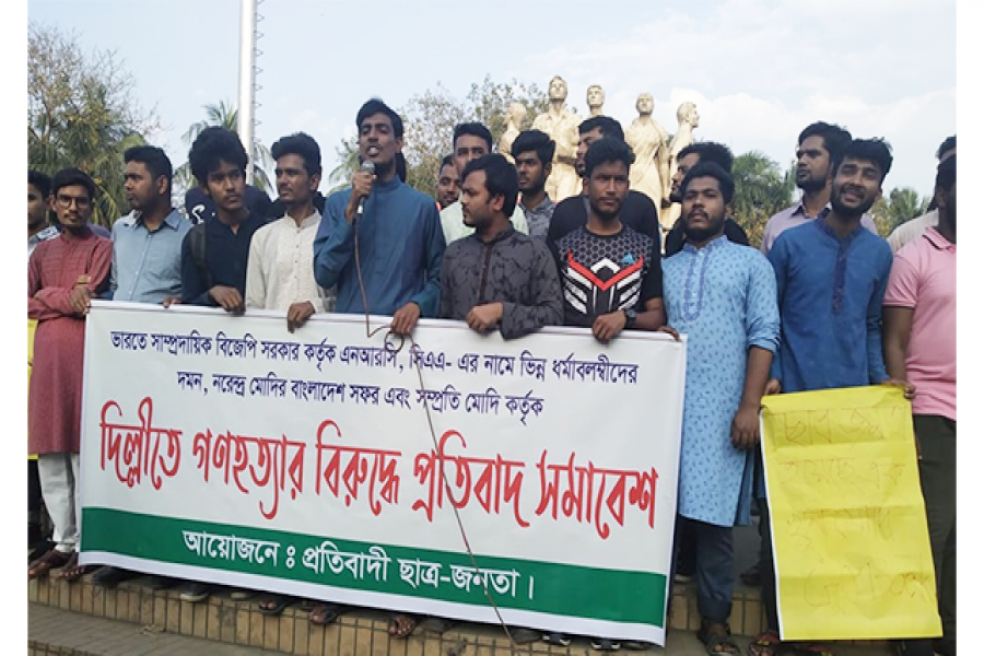 ভারতের এনআরসি-সিএএ’র নামে ভিন্ন ধর্মাবলম্বীদের দমন, নরেন্দ্র মোদির বাংলাদেশ সফর এবং সম্প্রতি দেশটির রাজধানী দিল্লিতে গণহত্যার প্রতিবাদে বিক্ষোভ সমাবেশের আয়োজন করেছে প্রতিবাদী ছাত্র জনতা। শুক্রবার বিকাল সাড়ে চারটার দিকে ঢাকা বিশ্ববিদ্যালয় রাজুর ভাস্কর্যের পাদদেশে এই প্রতিবাদ সমাবেশ শুরু হয়।