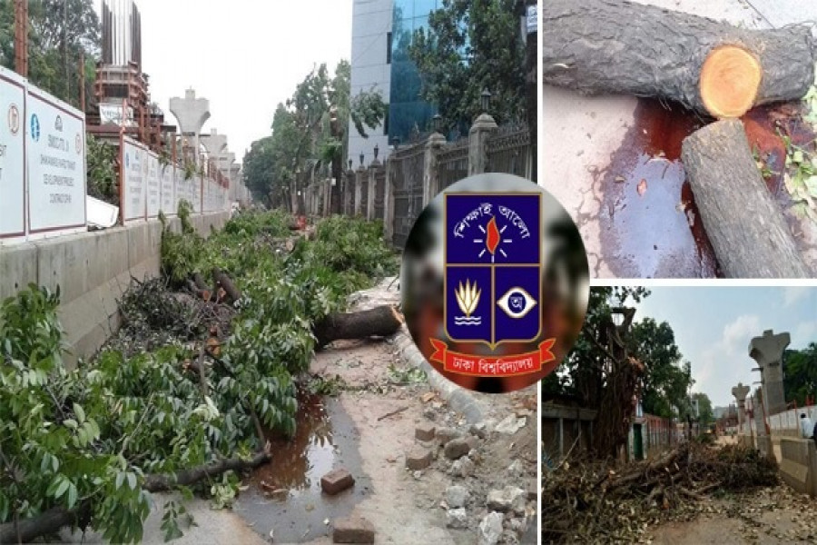 নভেল করোনাভাইরাসের কারণে দীর্ঘদিন ধরেই বন্ধ রয়েছে ঢাকা বিশ্ববিদ্যালয়। হলগুলোও ফাঁকা। এ পরিস্থিতির মধ্যেই ঢাকা বিশ্ববিদ্যালয়ের টিএসসি থেকে দোয়েল চত্বর পর্যন্ত সড়কের পাশের সবগুলো গাছ কেটে ফেলেছে সংশ্লিষ্টরা। জানা গেছে, মেট্রোরেল প্রকল্পের জন্য রাস্তা সম্প্রসারণ করতে গাছগুলো কেটে ফেলা হয়েছে।