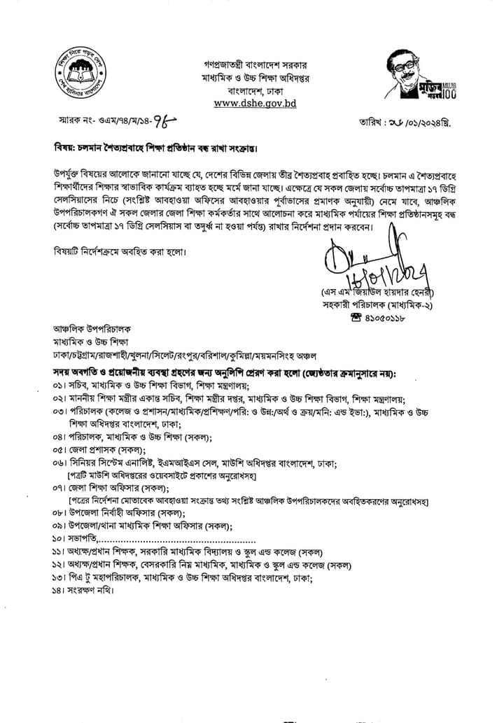 চিঠিতে বলা হয়েছে, ‘দেশের বিভিন্ন জেলায় তীব্র শৈত্যপ্রবাহ প্রবাহিত হচ্ছে। চলমান এ শৈত্যপ্রবাহে শিক্ষার্থীদের শিক্ষার স্বাভাবিক কার্যক্রম ব্যাহত হচ্ছে মর্মে জানা যাচ্ছে। এক্ষেত্রে যে সকল জেলায় সর্বোচ্চ তাপমাত্রা ১৭ ডিগ্রি সেলসিয়াসের নিচে (সংশ্লিষ্ট আবহাওয়া অফিসের আবহাওয়ার পূর্বাভাসের প্রমাণক অনুযায়ী) নেমে যাবে, আঞ্চলিক উপপরিচালকগণ ঐ সকল জেলার জেলা শিক্ষা কর্মকর্তার সাথে আলোচনা করে মাধ্যমিক পর্যায়ের শিক্ষা প্রতিষ্ঠানসমূহ বন্ধ (সর্বোচ্চ তাপমাত্রা ১৭ ডিগ্রি সেলসিয়াস বা তদূর্ধ্ব না হওয়া পর্যন্ত) রাখার নির্দেশনা প্রদান করবেন।’