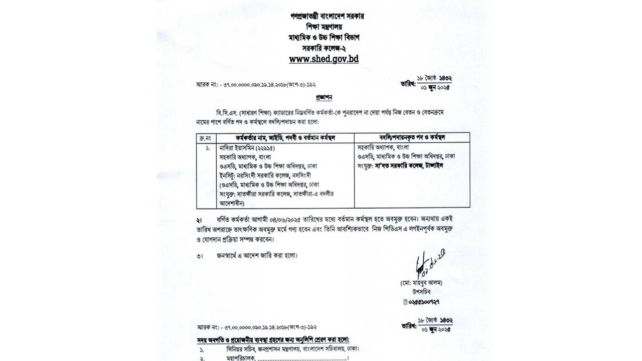 উপসচিব মাহবুব আলমের সই করা প্রজ্ঞাপনে বলা হয়েছে, ‘বিসিএস (সাধারণ শিক্ষা) ক্যাডারের কর্মকর্তা নাদিরা ইয়াসমিনকে পুনরাদেশ না দেওয়া পর্যন্ত নিজ বেতন ও বেতন ক্রমে ওএসডি হিসেবে মাধ্যমিক ও উচ্চশিক্ষা অধিদপ্তরে থেকে টাঙ্গাইলের সা’দত সরকারি কলেজে সংযুক্ত করা হয়েছে।’